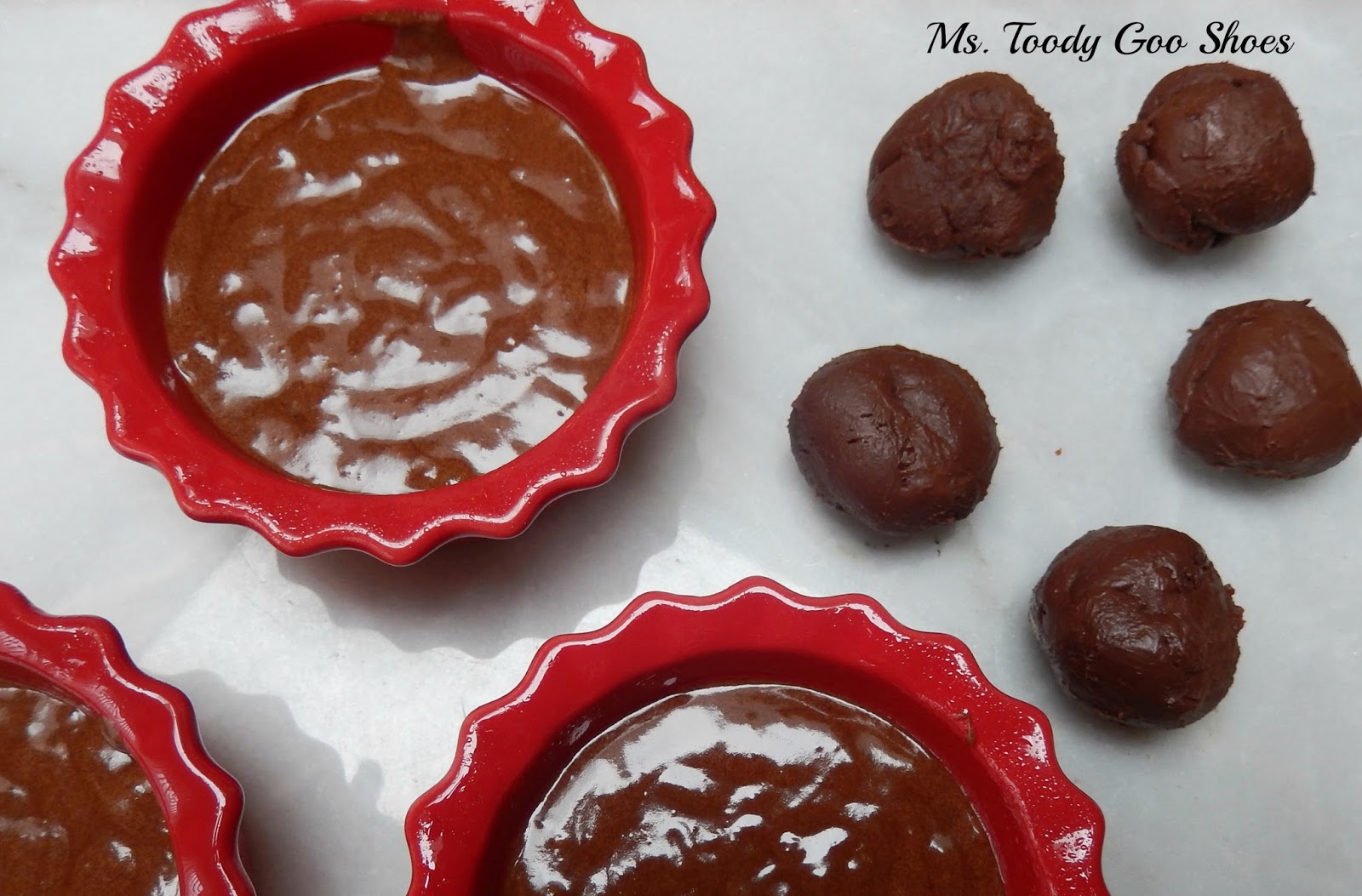 Unless you are a confident and relaxed hostess -- which I am most definitely not -- who doesn't mind whipping up a dessert while your guests are waiting with their forks in hand, the cakes can be assembled in advance. Just keep them in the fridge, and take them out about 1/2 hour before you want to serve them; then bake as directed, below.
